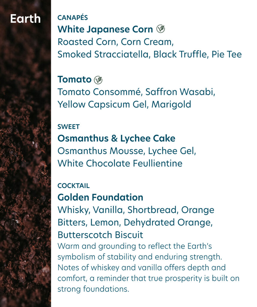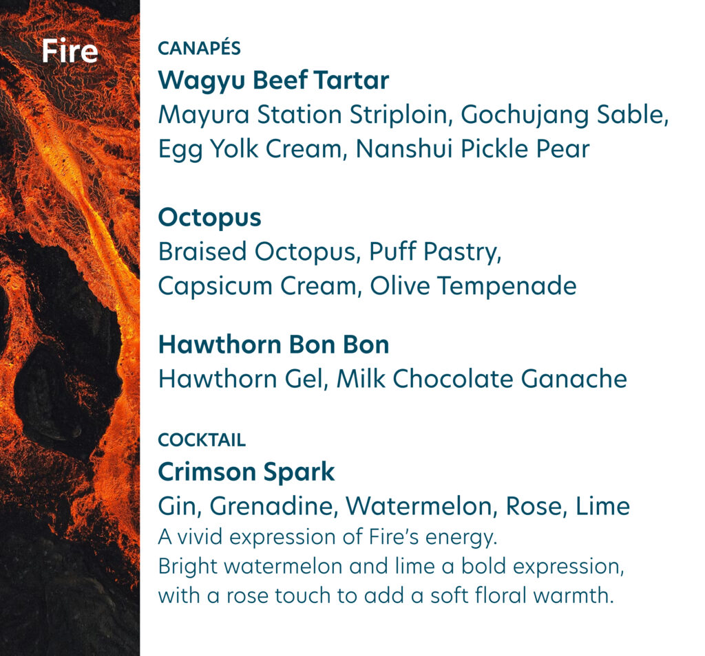 Inspired by the Five Elements of the Chinese Zodiac, we transform elemental philosophy into a curated sensory experience. Each canapé and drink reflects the essence of its element, from fresh vitality and growth to depth, intensity and refinement.